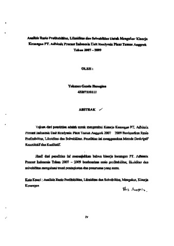 Tujuan dari penelitian adalah untuk mengetahui Kinerja Keuangan PT. Adhimix Precast Indonesia Unit Readymix Plant Taman Anggrek 2007 - 2009 Berdasarkan Rasio Profitabilitas, Likuiditas dan Solvabilitas. Penelitian ini menggunakan Metode Deskriptif Kuantitatif dan Kualitatif. Hasil dari penelitian ini menunjukkan bahwa kinerja keuangan PT. Adhimix Precast Indonesia Tahun 2007 - 2009 berdasarkan rasio profitabilitas, likuiditas dan solvabilitas mengalami trend peningkatan dan penurunan yang sama.