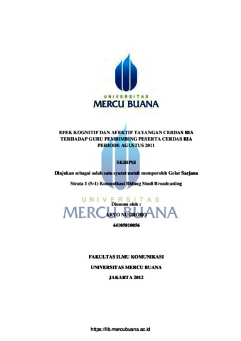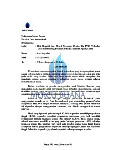 NUGROHO, ARYO (2012) EFEK KOGNITIF DAN AFEKTIF TAYANGAN CERDAS RIA TEHADAP GURU PEBIMBING PESERTA CERDAS RIA PERIODE AGUSTUS 2011. S1 thesis, Universitas Mercu Buana Jakarta.