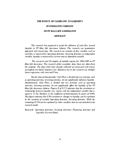 This research has purposed to proof the influence of cash flow toward liquidity in PT Maa Life Assurance Jakarta. This research use quantitative approach with causal type. This research use contains of four variable, such as cash flow is measured by Operating Activities, Investing Activities as independent variable, liquidity is measured by current ratio as dependent variable. This research used 48 samples of monthly reports for 2006-2009 on PT Maa Life Assurance. This research utilize secondary data, those are taken from the company. The data which have already collected are processed with classic assumption test before hypotesis test. Hypotesis test in this research use multiple linear regression, with t-test and F-test. Results showed that partially, Cash Flow is divided into two activities such as operating activities, investing activities, do not significantly influence liquidity. Simultaneously Cash Flows is divided into two activities such as operating activities, investing activities, do not significantly affect the liquidity of the PT Maa Life Assurance Jakarta. Figures R of 0.221 indicates that the correlation or relationship between liquidity very closely with the independent variable that is equal to 22.1%. Numbers or the coefficient of determination R square of 0.049. This figure indicates that 4.9% variation or changes in liquidity can be explained by the variation of variable Operating Activities, Investing Activities. While the remaining 95.1% can be explained by other variables that are not included in the research model.