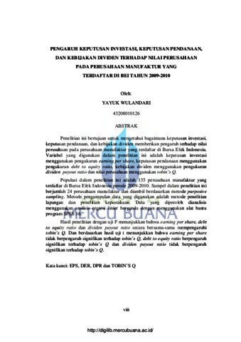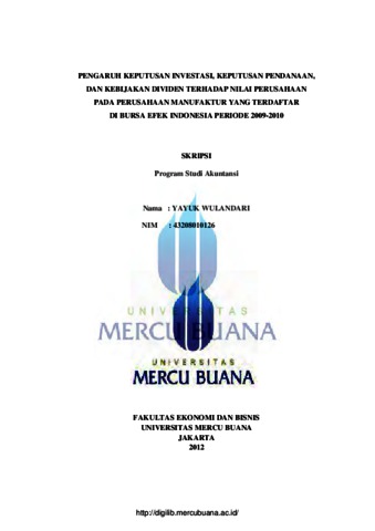WULANDARI, YAYUK (2012) PENGARUH KEPUTUSAN INVESTASI, KEPUTUSAN PENDANAAN, DAN KEBIJAKAN DIVIDEN TERHADAP NILAI PERUSAHAAN PADA PERUSAHAAN MANUFAKTUR YANG TERDAFTAR DI BURSA EFEK INDONESIA PERIODE 2009-2010. S1 thesis, Universitas Mercu Buana Jakarta.