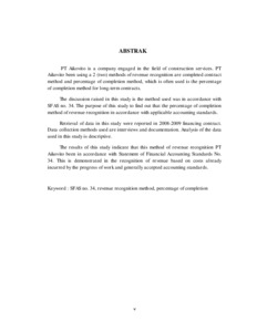 PT Aikovito is a company engaged in the field of construction services. PT Aikovito been using a 2 (two) methods of revenue recognition are completed contract method and percentage of completion method, which is often used is the percentage of completion method for long-term contracts. The discussion raised in this study is the method used was in accordance with SFAS no. 34. The purpose of this study to find out that the percentage of completion method of revenue recognition in accordance with applicable accounting standards. Retrieval of data in this study were reported in 2008-2009 financing contract. Data collection methods used are interviews and documentation. Analysis of the data used in this study is descriptive. The results of this study indicate that this method of revenue recognition PT Aikovito been in accordance with Statement of Financial Accounting Standards No. 34. This is demonstrated in the recognition of revenue based on costs already incurred by the progress of work and generally accepted accounting standard