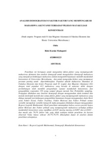 MAHAPUTRI, RIZKI KURNIA (2012) ANALISIS DEMOGRAFI DAN FAKTOR FAKTOR YANG MEMPENGARUHI MAHASISWA AKUNTANSI TERHADAP PILIHAN MATAKULIAH KONSENTRASI (Studi empiris Program studi S1 dan Magister Akuntansi di Fakultas Ekonomi dan Bisnis Universitas Mercubuana ). S1 thesis, Universitas Mercu Buana Jakarta.