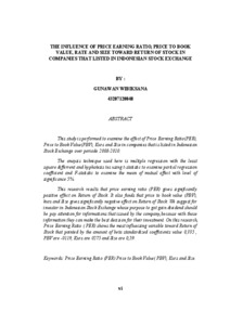 This study is performed to examine the effect of Price Earning Ratio(PER), Price to Book Value(PBV), Kurs and Size in companies that is listed in Indonesian Stock Exchange over periode 2008-2010. The anaysis technique used here is multiple regression with the least square differrent and hyphotesis tes using t-statistic to examine partial regression coefficient and F-statistic to examine the mean of mutual effect with level of significance 5%. This research results that price earning ratio (PER) gives significantly positive effect on Return of Stock. It also funds that price to book value (PBV), kurs and Size gives significantly negative effect on Return of Stock. We suggest for investor in Indonesian Stock Exchange whose purpose to got gain dividend should be pay attention for informations that issued by the company,because with those information they can make the best decision for their investment. On this research, Price Earning Ratio ( PER) shows the most influecsing variable toward Return of Stock that pointed by the amount of beta standardized coefficients value 0,335 , PBV are -0119, Kurs are 0275 and Size are 0,59.