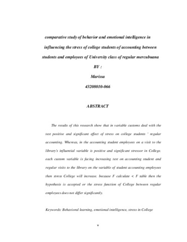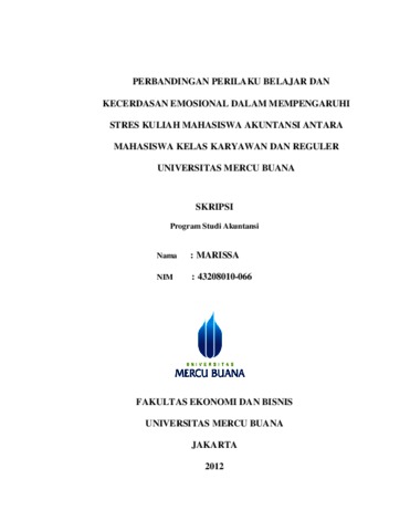 MARISSA, MARISSA (2012) PERBANDINGAN PERILAKU BELAJAR DAN KECERDASAN EMOSIONAL DALAM MEMPENGARUHI STRES KULIAH MAHASISWA AKUNTANSI ANTARA MAHASISWA KELAS KARYAWAN DAN REGULER UNIVERSITAS MERCU BUANA. S1 thesis, Universitas Mercu Buana Jakarta.