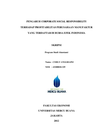 ANGGRAINI, CERLY (2012) PENGARUH CORPORATE SOCIAL RESPONSIBILITY TERHADAP PROFITABILITAS PERUSAHAAN MANUFAKTUR YANG TERDAFTAR DI BURSA EFEK INDONESIA. S1 thesis, Universitas Mercu Buana Jakarta.