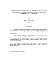 This study is investigate the influence of Corporate Social Responsibility to the profitability of manufacturing companies listed on Indonesia Stock Exchange. The aims of this research are to know : The influence of CSR to Profitability of manufacturing. This research sample is CSR disclosure on manufacture sector consumer goods industry in 2009 and 2010 by using method of purposive sampling. There are 24 companies in 2009 and 2010 which fulfilling criterion as this research sample. The analysis methods of this research used simple regression analysis for hypothesis 1. The result of this research shows that Corporate Social Responsibility doesn’t have significant influence to profitability with t count = 1,421; and Significant =0,169