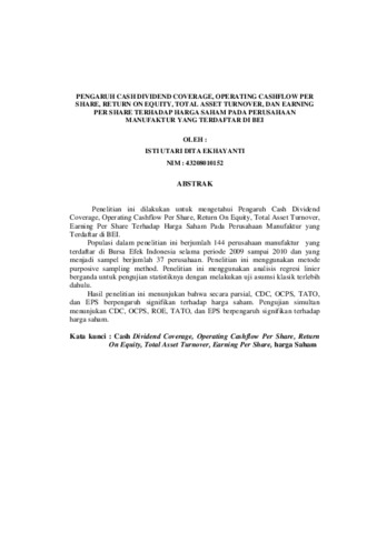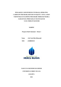 EKHAYANTI, ISTI UTARI DITA (2012) PENGARUH CASH DIVIDEND COVERAGE, OPERATING CASHFLOW PER SHARE, RETURN ON EQUITY, TOTAL ASSET TURNOVER, DAN EARNING PER SHARE TERHADAP HARGA SAHAM PADA PERUSAHAAN MANUFAKTUR YANG TERDAFTAR DI BEI. S1 thesis, Universitas Mercu Buana Jakarta.