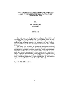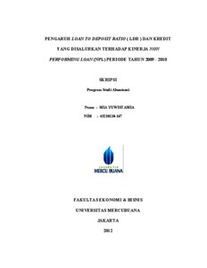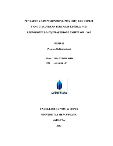 YUWISTAMIA, MIA (2012) PENGARUH LOAN TO DEPOSIT RATIO ( LDR ) DAN KREDIT YANG DISALURKAN TERHADAP KINERJA NON PERFORMING LOAN (NPL) PERIODE TAHUN 2009 - 2010. S1 thesis, Universitas Mercu Buana Jakarta.
