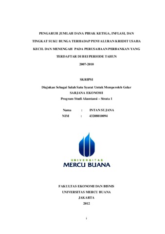 SUJANA, INTAN (2012) PENGARUH JUMLAH DANA PIHAK KETIGA, INFLASI, DAN TINGKAT SUKU BUNGA TERHADAP PENYALURAN KREDIT USAHA KECIL DAN MENENGAH PADA PERUSAHAAN PERBANKAN YANG TERDAFTAR DI BEI PERIODE TAHUN 2007-2010. S1 thesis, Universitas Mercu Buana Jakarta.