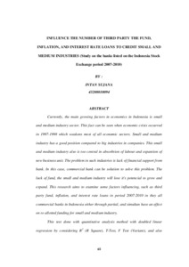 Currently, the main growing factors in economics in Indonesia is small and medium industry sector. This fact can be seen when economic crisis occurred in 1997-1998 which weakens most of all economic sectors. Small and medium industry has a good position compared to big industries in companies. This small and medium industry also is too central in absorbtion of labour and expantion of new business unit. The problem in such industries is lack of financial support from bank. In this case, commercial bank can be solution to solve this problem. The luck of fund, the small and medium industry will lose it's potencial to grow and expand. This research aims to examine some factors influencing, such as third party fund, inflation, and interest rate loans in period 2007-2010 in they all commercial banks in Indonesia either through partial, and simultan have an effect on to allotted funding for small and medium industry. This test done with quantitative analysis method with doubled linear regression by considering R2 (R Square), T-Test, F Test (Variant), and also multicolinierity, heterocodasticity, and autocorrelation. This at method can examine factors influencing allocated funds considerably small and medium industry. The result of analysis by simultan with level of significant 5% shows the amount of third party fund, inflation, and interest rate loans influence by significantly to credit of small and medium industry. Thare three variables in this research can explain changes about to 77,1% and the rest 22,9% influenced by other factors outside this model. In parsial model with level of significant 5% only third party fund influence by significantly to allocated fund at small and medium industry. This can be seen from T-value of 12,974 which is the most dominant variables influencing funds of small and medium industry is the amount of third party fund.