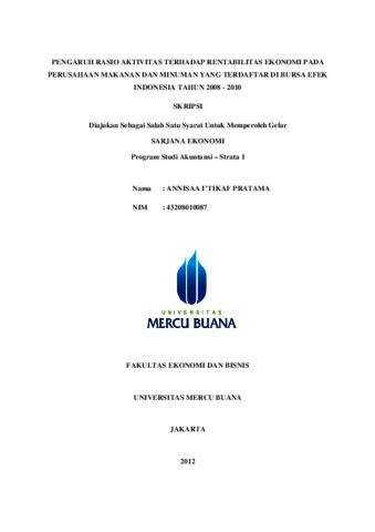 PRATAMA, ANNISAA I'TIKAF (2012) PENGARUH RASIO AKTIVITAS TERHADAAP RENTABILITAS EKONOMI PADA PERUSAHAAN MAKANAN DAN MINUMAN YANG TERDAFTAR DI BURSA EFEK INDONESIA TAHUN 2008 - 2010. S1 thesis, Universitas Mercu Buana Jakarta.