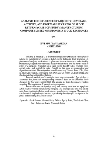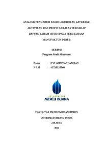 AMZAN, EVI APRIYANI (2012) ANALISIS PENGARUH RASIO LIKUIDITAS, LEVERAGE, AKTIVITAS, DAN PROFITABILITAS TERHADAP RETURN SAHAM (STUDI PADA PERUSAHAAN MANUFAKTUR DI BEI). S1 thesis, Universitas Mercu Buana Jakarta.