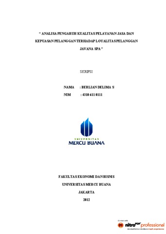 SURATIN, BERLIAN DELIMA (2012) ANALISA PENGARUH KUALITAS PELAYANAN JASA DAN KEPUASAN PELANGGAN TERHADAP LOYALITAS PELANGGAN JAVANA SPA. S1 thesis, Universitas Mercu Buana Jakarta.