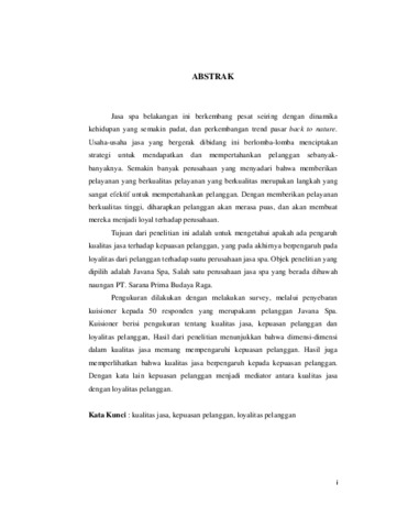 Jasa spa belakangan ini berkembang pesat seiring dengan dinamika kehidupan yang semakin padat, dan perkembangan trend pasar back to nature. Usaha-usaha jasa yang bergerak dibidang ini berlomba-lomba menciptakan strategi untuk mendapatkan dan mempertahankan pelanggan sebanyakbanyaknya. Semakin banyak perusahaan yang menyadari bahwa memberikan pelayanan yang berkualitas pelayanan yang berkualitas merupakan langkah yang sangat efektif untuk mempertahankan pelanggan. Dengan memberikan pelayanan berkualitas tinggi, diharapkan pelanggan akan merasa puas, dan akan membuat mereka menjadi loyal terhadap perusahaan. Tujuan dari penelitian ini adalah untuk mengetahui apakah ada pengaruh kualitas jasa terhadap kepuasan pelanggan, yang pada akhirnya berpengaruh pada loyalitas dari pelanggan terhadap suatu perusahaan jasa spa. Objek penelitian yang dipilih adalah Javana Spa, Salah satu perusahaan jasa spa yang berada dibawah naungan PT. Sarana Prima Budaya Raga. Pengukuran dilakukan dengan melakukan survey, melalui penyebaran kuisioner kepada 50 responden yang merupakann pelanggan Javana Spa. Kuisioner berisi pengukuran tentang kualitas jasa, kepuasan pelanggan dan loyalitas pelanggan, Hasil dari penelitian menunjukkan bahwa dimensi-dimensi dalam kualitas jasa memang mempengaruhi kepuasan pelanggan. Hasil juga memperlihatkan bahwa kualitas jasa berpengaruh kepada kepuasan pelanggan. Dengan kata lain kepuasan pelanggan menjadi mediator antara kualitas jasa dengan loyalitas pelanggan.