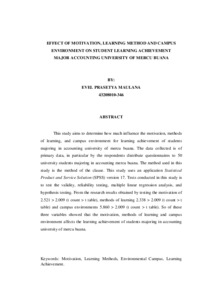 Penelitian ini bertujuan untuk mengetahui seberapa besar pengaruh motivasi, metode belajar, dan lingkungan kampus terhadap prestasi belajar mahasiswa jurusan akuntansi universitas mercu buana. Data yang dikumpulkan adalah data primer, yaitu dengan cara menyebarkan kuesioner kepada 50 responden mahasiswa jurusan akuntansi universitas mercu buana. Metode yang digunakan dalam penelitian ini adalah metode klausal. Penelitian ini menggunakan aplikasi Statistical Product and Service Solution (SPSS) versi 17. Pengujian yang dilakukan dalam penelitian ini adalah uji validitas, uji reliabilitas, analisis regresi linear berganda, dan uji hipotesis. Dari hasil penelitian berdasarkan pengujian tersebut didapatkan hasil motivasi 2,521 > 2,009 ( t hitung > t tabel ), metode belajar 2,338 > 2,009 ( t hitung > t tabel ) dan lingkungan kampus 5,860 > 2,009 ( t hitung > t tabel ). Maka dari ketiga variabel tersebut menunjukan bahwa motivasi, metode belajar dan lingkungan kampus berpengaruh terhadap prestasi belajar mahasiwa jurusan akuntansi universitas mercu buana.