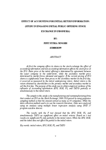 At first the company offers its shares in the stock exchange the effect of accounting information and non-accounting information affects the stock price at the IPO. Share price at the initial offering is determined by agreement between the issuer company to the underwriter, while the secondary market price determined by market forces (demand and supply). If the current pricing of IPO shares is significantly lower than prices in the secondary market on the first day, it occurred as measured by the initial underpricing return. Initial return is the return obtained by shareholders in the primary market and secondary market to sell the first day. The purpose of this study was to obtain empirical evidence of the influence of accounting information (EPS, ROE, FL, and TATO) partially or simultaneously to the initial return. The sample in this study is the manufacturing and nonmanufacturing firms that conduct an IPO on the Stock Exchange 2008-2010 period by using purposive sampling method so that the amount earned as many as 34 companies. While the data collection method used is to use the research literature. Data were analyzed using an analysis using multiple linear regression analysis using SPSS 17 program assistive devices. The results with the F test showed that the EPS, ROE, FL, and simultaneously TATO no significant effect on initial returns. Based on t test results are significant FL only partially to the initial return. While the EPS, ROE, and the tattoo does not affect the partial to the initial return.