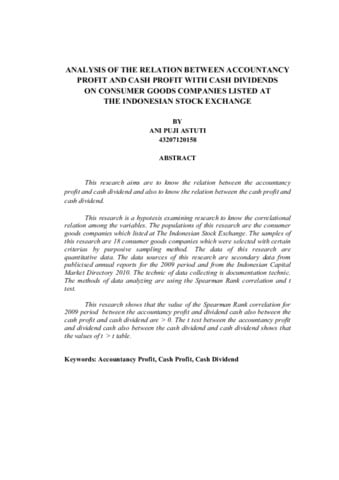 This research aims are to know the relation between the accountancy profit and cash dividend and also to know the relation between the cash profit and cash dividend. This research is a hypotesis examining research to know the correlational relation among the variables. The populations of this research are the consumer goods companies which listed at The Indonesian Stock Exchange. The samples of this research are 18 consumer goods companies which were selected with certain criterias by purposive sampling method. The data of this research are quantitative data. The data sources of this research are secondary data from publicised annual reports for the 2009 period and from the Indonesian Capital Market Directory 2010. The technic of data collecting is documentation technic. The methods of data analyzing are using the Spearman Rank correlation and t test. This research shows that the value of the Spearman Rank correlation for 2009 period between the accountancy profit and dividend cash also between the cash profit and cash dividend are > 0. The t test between the accountancy profit and dividend cash also between the cash dividend and cash dividend shows that the values of t > t table