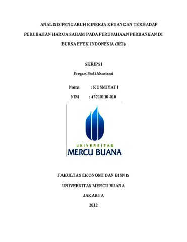 KUSMIYATI, KUSMIYATI (2012) ANALISIS PENGARUH KINERJA KEUANGAN TERHADAP PERUBAHAN HARGA SAHAM PADA PERUSAHAAN PERBANKAN DI BURSA EFEK INDONESIA (BEI). S1 thesis, Universitas Mercu Buana Jakarta.