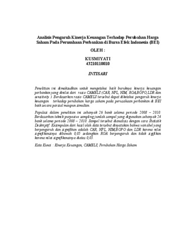 Penelitian ini dimaksudkan untuk mengetahui baik buruknya kinerja keuangan perbankan yang dinilai dari rasio CAMELS (CAR, NPL, NIM, ROA,BOPO,LDR dan sensitivity ). Berdasarkan rasio CAMELS tersebut dapat diketahui pengaruh kinerja keuangan terhadap perubahan harga saham pada perusahaan perbankan di BEI baik secara parsial maupun simultan. Populasi dalam penelitian ini sebanyak 26 bank selama periode 2008 – 2010. Berdasarkan teknik purposive sampling jumlah sampel yang digunakan sebanyak 24 bank selama periode 2008 – 2010. Sampel tersebut dianalisis dengan cara Statistik Deskriptif. Kesimpulan dari hasil olah data tersebut dinyatakan bahwa variabel yang berpengaruh dan signifikan adalah CAR, NPL, NIM,BOPO dan LDR karena nilai signifikansinya dibawah 0,05 sedan