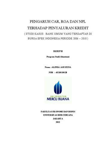 AGUSTINA, ALINDA (2012) PENGARUH CAR, ROA DAN NPL TERHADAP PENYALURAN KREDIT ( STUDI KASUS : BANK UMUM YANG TERDAFTAR DIBURSA EFEK INDONESIA PERIODE 2006 – 2010 ). S1 thesis, Universitas Mercu Buana Jakarta.