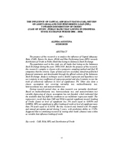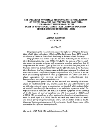 The purpose of this research is to analyze the influence of Capital Adequacy Ratio (CAR), Return On Assets (ROA) and Non Performing Loan (NPL) towards distribution of Credit at Public Bank that listing in Indonesia Stock Exchange. The population used in this study are all banks that listing on the Indonesia Stock Exchange during the years 2006-2010. And for the purpose of this research, this research’s samples is chosen with a purposive sampling method and find 30 companies that the criteria. Types of data used are secondary data from published financial statements and downloaded through the official website of the Indonesia Stock Exchange. Analysis technique used is double regression and hypothesis test use t-statistic to test coefficient of regression partial and also f-statistic to test the truth of collectively influence in level of significance 5%. Other also done a classic assumption test covering normality test, multicolliniearity test, heteroscedasity test, and autocorrelation test. During research period show as data research was normality distributed. Based on multicolliniearity test, heteroscedasity test, and autocorrelation test variable digressing of classic assumption has not founded, which indicated that the available data has fulfil the condition to use multilinier regression model. The regression’s result that data CAR and ROA in partial significant toward Lending of Credit (Loan) at level of significant less 5% (each equal to 0,001% and 0,000%). NPL not significant to effect lending of credit at level of significant more than 5% (each equal to 0,261%). But this research only limited with 30 sample and annual perception period during 5 years, with prediction ability to 17,8%. Suggested that to continuing research by testing other bank’s finance ratio within as variable that influence lending of credit.