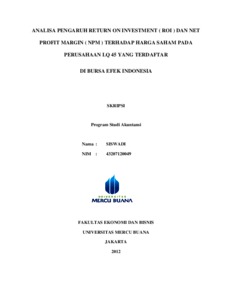 SISWANDI, SISWANDI (2012) ANALISA PENGARUH RETURN ON INVESTMENT ( ROI ) DAN NET PROFIT MARGIN ( NPM ) TERHADAP HARGA SAHAM PADA PERUSAHAAN LQ 45 YANG TERDAFTAR DI BURSA EFEK INDONESIA. S1 thesis, Universitas Mercu Buana Jakarta.
