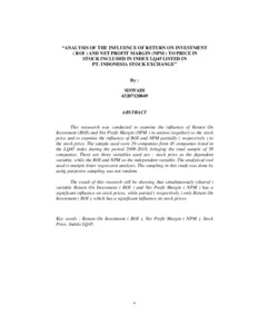 This reasearch was conducted to examine the influence of Return On Investment (ROI) and Net Profit Margin (NPM ) in unison (together) to the stock price and to examine the influence of ROI and NPM partially ( respectively ) to the stock price. The sample used were 29 companies from 45 companies listed in the LQ45 index during the period 2009-2010, bringing the total sample of 58 companies. There are three variables used are : stock price as the dependent variable, while the ROI and NPM as the independent variable. The analytical tool used is mutiple linier regression analysis. The sampling in this study was done by using purposive sampling was not random. The result of this research will be showing that simultaneously (shared ) variable Return On Investment ( ROI ) and Net Profit Margin ( NPM ) has a significant influence on stock prices, while partial ( respectively ) only Return On Investment ( ROI ), which has a significant influence on stock prices
