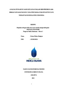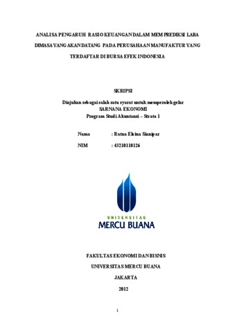 SIANIPAR, RATNA ELVINA (2012) ANALISA PENGARUH RASIO KEUANGAN DALAM MEM PREDIKSI LABA DIMASA YANG AKAN DATANG PADA PERUSAHAAN MANUFAKTUR YANG TERDAFTAR DI BURSA EFEK INDONESIA. S1 thesis, Universitas Mercu Buana Jakarta.