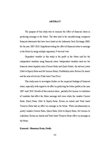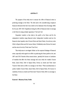 The purpose of this study was to examine the effect of financial ratios in predicting earnings in the future. The data used is the manufacturing company's financial statements that have been listed on the Indonesia Stock Exchange (BEI) for the year 2007-2010. Hypothesis testing the effect of financial ratios to earnings in the future by using multiple regression, F test and t test. Dependent variable in this study is the profit in the future and for the independent variables using financial ratios. Independent variables used are the financial ratios liquidity ratio (Current Ratio and Quick Ratio), the solvency ratio (Debt to Equity Ratio and Net Income Ratio), Profitability ratio (Return On Asset) and the ratio of activity (Total Asset Turn Over). This study aims to investigate further on the empirical findings of financial ratios, especially with regard to its effect in predicting the future profits in the year 2007 until 2010. Results of this research show, partially Net Income to Liabilities of variables that affect the future earnings will come while the variable Current Ratio, Quick Ratio, Debt to Equity Ratio, Return on Assets and Total Asset Turnover Ratio had no effect on earnings in the future. While simultaneously or jointly variable Current Ratio, Quick Ratio, Debt to Equity Ratio, Net Income to Liabilities, Return on Assets and Total Asset Turnover Ratio effect on earnings in the future.