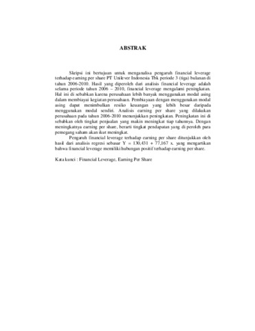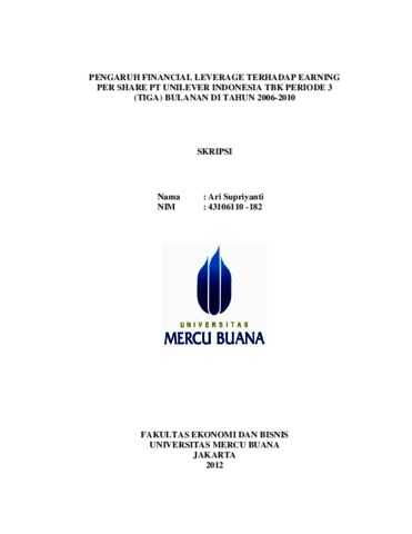 SUPRIYANTI, ARI (2012) PENGARUH FINANCIAL LEVERAGE TERHADAP EARNING PER SHARE PT UNILEVER INDONESIA TBK PERIODE 3 (TIGA) BULANAN DI TAHUN 2006-2010. S1 thesis, Universitas Mercu Buana Jakarta.