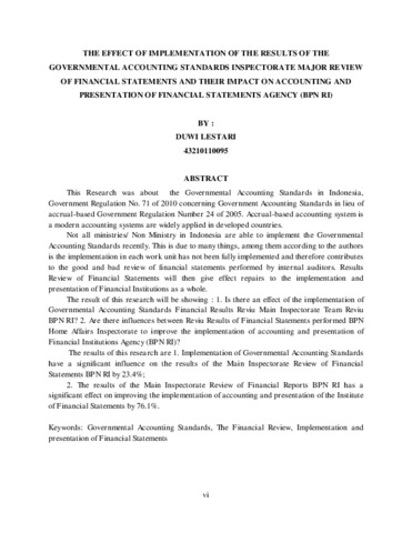 LESTARI, DUWI (2012) PENGARUH IMPLEMENTASI STANDAR AKUNTANSI PEMERINTAHAN TERHADAP HASIL REVIU LAPORAN KEUANGAN INSPEKTORAT UTAMA DAN DAMPAKNYA TERHADAP PENYELENGGARAAN AKUNTANSI DAN PENYAJIAN LAPORAN KEUANGAN LEMBAGA (BPN RI). S1 thesis, Universitas Mercu Buana Jakarta.
