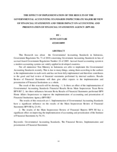 Penelitian ini tentang Standar Akuntansi Pemerintahan di Indonesia, Peraturan Pemerintah Nomor 71 tahun 2010 tentang Standar Akuntansi Pemerintahan (SAP) berbasis akrual sebagai pengganti Peraturan Pemerintah Nomor 24 tahun 2005. Sistem akuntansi berbasis akrual merupakan sistem akuntansi modern yang banyak diterapkan di negara maju. Belum semua kementerian / Lembaga Non Kementerian di Indonesia mampu menerapkan Standar Akuntansi Pemerintahan (SAP) yang baru ini. Hal ini disebabkan berbagai hal, diantaranya menurut penulis adalah implementasinya/ pelaksanaan di setiap Satuan Kerja belum sepenuhnya berjalan sehingga berpengaruh terhadap baik buruknya hasil reviu Laporan Keuangan yang dilakukan oleh auditor internal. Hasil reviu Laporan Keuangan ini kemudian akan memberikan dampak perbaikan terhadap penyelenggaraan dan penyajian Laporan Keuangan Lembaga secara keseluruhan. Tujuan dari Penelitian ini adalah untuk mengetahui : 1. Apakah berpengaruh Implementasi Standar Akuntansi Pemerintahan terhadap Hasil Reviu Laporan Keuangan Tim Reviu Inspektorat Utama BPN RI ? 2. Apakah berpengaruh antara Hasil Reviu Laporan Keuangan yang dilakukan Inspektorat Utama BPN RI terhadap perbaikan penyelenggaraan Akuntansi Lembaga dan penyajian Laporan Keuangan Lembaga (BPN RI) ? Hasil dari penelitian ini adalah 1. Implementasi Standar Akuntansi Pemerintahan memiliki pengaruh yang cukup signifikan terhadap hasil reviu Laporan Keuangan Inspektorat Utama BPN RI yakni sebesar 23,4 %; 2. Hasil Reviu Laporan Keuangan Inspektorat Utama BPN RI memiliki pengaruh yang signifikan terhadap perbaikan penyelenggaraan akuntansi dan penyajian Laporan Keuangan Lembaga sebesar 76,1 %.