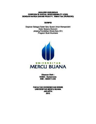 SUMARWOTO, SUMARWOTO (2012) ANALISIS HUBUNGAN CORPORATE SOCIAL RESPONSIBILITY (CSR) DENGAN HARGA SAHAM PADA PT. TIMAH TBK (PERSERO). S1 thesis, Universitas Mercu Buana Jakarta.