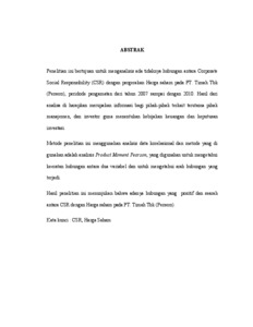Penelitian ini bertujuan untuk menganalisis ada tidaknya hubungan antara Corporate Social Responsibility (CSR) dengan pergerakan Harga saham pada PT. Timah Tbk (Persero), peridode pengamatan dari tahun 2007 sampai dengan 2010. Hasil dari analisa di harapkan merupakan informasi bagi pihak-pihak terkait terutama pihak manajemen, dan investor guna menentukan kebijakan keuangan dan keputusan investasi. Metode penelitian ini menggunakan analisis data korelasional dan metode yang di gunakan adalah analisis Product Moment Pearson, yang digunakan untuk mengetahui keeratan hubungan antara dua variabel dan untuk mengetahui arah hubungan yang terjadi. Hasil penelitian ini menunjukan bahwa adanya hubungan yang positif dan searah antara CSR dengan Harga saham pada PT. Timah Tbk (Persero).