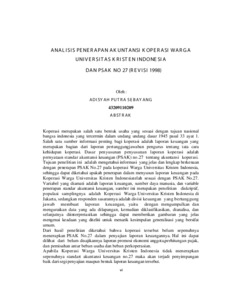 Koperasi merupakan salah satu bentuk usaha yang sesuai dengan tujuan nasional bangsa indonesia yang tercermin dalam undang undang dasar 1945 pasal 33 ayat 1. Salah satu sumber informasi penting bagi koperasi adalah laporan keuangan yang merupakan bagian dari laporan pertanggungjawaban pengurus tentang tata cara kehidupan koperasi. Dasar penyusunan penyusunan laporan koperasi adalah pernyataan standar akuntansi keuangan (PSAK) no.27 tentang akuntansi koperasi. Tujuan penelitian ini adalah mengetahui informasi yang jelas dan lengkap berkenaan dengan penerapan PSAK No.27 pada koperasi Warga Universitas Kristen Indonesia, sehingga dapat diketahui apakah penerapan dalam menyusun laporan keuangan pada Koperasi Warga Universitas Kristen Indonesiatelah sesuai dengan PSAK No.27. Variabel yang diamati adalah laporan keuangan, sumber daya manusia, dan variable penerapan standar akuntansi keuangan, sumber ini merupakan penelitian diskriptif, populasi samplingnya adalah Koperasi Warga Universitas Kristen Indonesia di Jakarta, sedangkan responden sasarannya adalah divisi keuangan yang bertanggung jawab membuat laporan keuangan, yaitu dengan mengumpulkan dan menguraikan data yang ada dilapangan, kemudian diklasifikasikan, dianalisa, dan selanjutnya diinterpretasikan sehingga dapat memberikan gambaran yang jelas mengenai keadaan yang diteliti untuk menarik kesimpulan generalisasi yang bersifat umum. Dari hasil penelitian diketahui bahwa koperasi tersebut belum sepenuhnya menerapkan PSAK No.27 dalam penyajian laporan keuangannya. Hal ini dapat dilihat dari belum disajikannya laporan promosi ekonomi anggota,perhitungan pajak, dan pemisahan antar beban usaha dan beban perkoperasian. Apabila Koperasi Warga Universitas Kristen Indonesia tidak menerapkan sepenuhnya standart akuntansi keuangan no.27 maka akan terjadi penyimpangan baik dari segi penyajian maupun bentuk laporan keuangan tersebut.