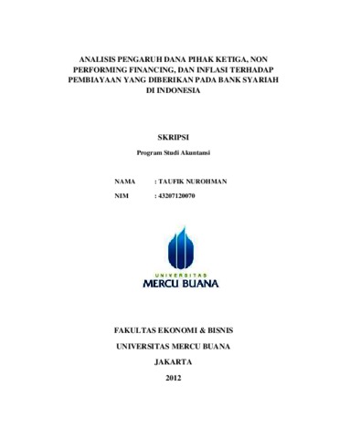 NUROHMAN, TAUFIK (2012) ANALISIS PENGARUH DANA PIHAK KETIGA, NON PERFORMING FINANCING, DAN INFLASI TERHADAP PEMBIAYAAN YANG DIBERIKAN PADA BANK SYARIAH DI INDONESIA. S1 thesis, Universitas Mercu Buana Jakarta.