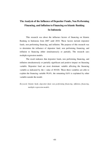 This research was about the influence factors of financing on Islamic Banking in Indonesia from 2007 until 2010. These factors include depositor funds, non performing financing, and inflation. The purpose of this research was to determine the influence of depositor fund, non performing financing, and inflation to financing either simultaneously or partially. The research uses multiple regression models. The result indicates that depositor funds, non performing financing, and inflation simultaneously or partially significant and positive impact on financing variable. Depositor fund are most dominant variable affecting the financing variable as indicated by the t value of 49,928. These three variables are able to explain the financing variable 99,4%, the remaining 0,6% is explained by other variable outside the model.