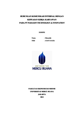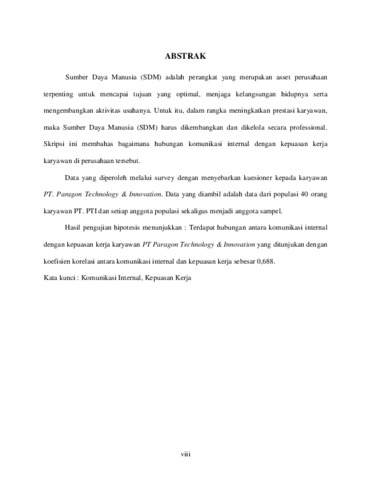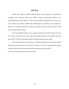Sumber Daya Manusia (SDM) adalah perangkat yang merupakan asset perusahaan terpenting untuk mencapai tujuan yang optimal, menjaga kelangsungan hidupnya serta mengembangkan aktivitas usahanya. Untuk itu, dalam rangka meningkatkan prestasi karyawan, maka Sumber Daya Manusia (SDM) harus dikembangkan dan dikelola secara professional. Skripsi ini membahas bagaimana hubungan komunikasi internal dengan kepuasan kerja karyawan di perusahaan tersebut. Data yang diperoleh melalui survey dengan menyebarkan kuesioner kepada karyawan PT. Paragon Technology & Innovation. Data yang diambil adalah data dari populasi 40 orang karyawan PT. PTI dan setiap anggota populasi sekaligus menjadi anggota sampel. Hasil pengujian hipotesis menunjukkan : Terdapat hubungan antara komunikasi internal dengan kepuasan kerja karyawan PT Paragon Technology & Innovation yang ditunjukan dengan koefisien korelasi antara komunikasi internal dan kepuasan kerja sebesar 0,688.