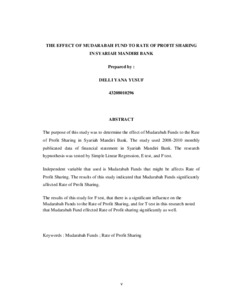 ujuan dari penelitian ini adalah untuk mengetahui pengaruh Dana Mudharabah terhadap Tingkat Bagi Hasil pada Bank Syariah Mandiri. Penelitian menggunakan data laporan keuangan publikasi bulanan 2008-2010 di Bank Mandiri Syariah.Analisis yang digunakan ada Regresi Linier Sederhana,Uji T, dan Uji F Variabel independen yang digunakan adalah Dana Mudharabah yang mempengaruhi Tingkat Bagi Hasil. Hasil penelitian ini menunjukan bahwa Dana Mudharabah secara signifikan mempengaruhi Tingkat Bagi Hasil. Hasil penelitian ini, untuk uji F, bahwa terdapat pengaruh yang signifikan antara Dana Mudharabah terhadap Tingkat Bagi Hasil, dan untuk uji T dalam penelitian diketahui bahwa Dana Mudharabah berpengaruh terhadap Tingkat Bagi Hasil.