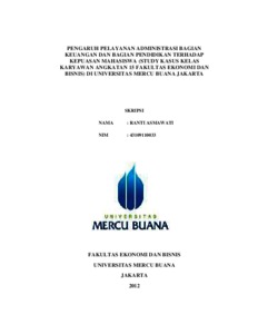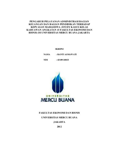 ASMAWATI, RANTI (2012) PENGARUH PELAYANAN ADMINISTRASI BAGIAN KEUANGAN DAN BAGIAN PENDIDIKAN TERHADAP KEPUASAN MAHASISWA (STUDY KASUS KELAS KARYAWAN ANGKATAN 15 FAKULTAS EKONOMI DAN BISNIS) DI UNIVERSITAS MERCU BUANA JAKARTA. S1 thesis, Universitas Mercu Buana Jakarta.