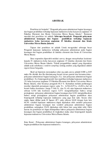 Tujuan dari penelitian ini adalah Untuk mengetahui seberapa besar Pengaruh kepuasan mahasiswa terhadap pelayanan administrasi pada bagian keuangan dan bagian pendidikan di fakultas ekonomi dan bisnis di Universitas Mercu Buana Data responden diperoleh melalui survey dengan menyebarkan kuisioner kepada 51 mahasiswa kelas karyawan angkatan 15 fakultas ekonomi dan bisnis Universitas Mercu Buana Jakarta. Teknik pengambilan sampel yang digunakan adalah acak sederhana ( random sampling) sedang analisis yang digunakan adalah regresi linear berganda. Hasil uji hipotesis menunjukan nilai sig pada anova adalah 0.000 < 0.05 maka Ho ditolak dan Ha diterimayang berarti secara parsial dan bersama-sama , pelayanan administrasi bagian keuangan ( X1) dan pelayanan administrasi bagian pendidikan ( X2) berpengaruh positif dan signifikan terhadap kepuasan mahasiswa (Y) kelas karyawan angkatan 15 Fakultas Ekonomi dan Bisnis Universitas Mercu Buana Jakarta, nilai besarnya pengaruh 64,4 %. Kemudian melalui perhitungan tersebut diperoleh persamaan regresi yaitu Y= 6,516+0,571x1 +0,281x2 hal ini berarti bahwa konstanta ( harga Y bila X1 dan X2 =0) atau kepuasan mahasiswa sebesar 6,516 lalu koefisien regresi 0,571 mengindikasikan bahwa setiap peningkatan pelayanan administrasi bagian keuangan dan 0,281 mengindikasikan bahwa setiap peningkatan pelayanan administrasi bagian pendidikan akan berpengaruh terhadap kepuasan mahasiswa yang juga ikut naik. Secara nilai angka dapat dilihat pada R Square (R2 ) yaitu sebesar 0,644 dengan kata lain 64,4% variabel kepuasan mahasiswa dapat dijelaskan oleh variabel pelayanan administrasi bagian keuangan dan variabel pelayanan administrasi bagian pendidikan, sedangkan 35,6% dijelaskan oleh faktor lain yang tidak teliti. Oleh karena itu penelitian ini dapat disimpulkan bahwa pelayanan administrasi bagian keuangan dan bagian pendidikan di tingkatkan maka