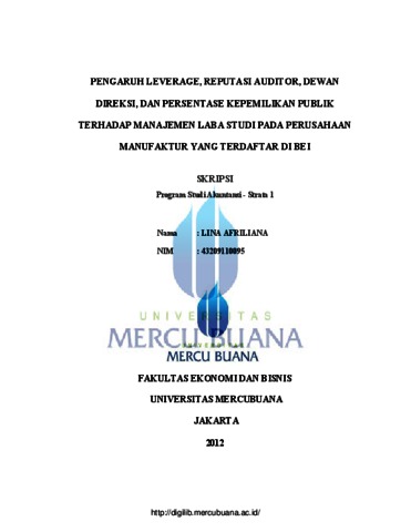 AFRILIANA, LINA (2012) PENGARUH LEVERAGE, REPUTASI AUDITOR, DEWAN DIREKSI, DAN PERSENTASE KEPEMILIKAN PUBLIK TERHADAP MANAJEMEN LABA STUDI PADA PERUSAHAAN MANUFAKTUR YANG TERDAFTAR DI BEI. S1 thesis, Universitas Mercu Buana Jakarta.