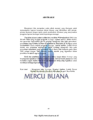 Manajemen laba merupakan usaha pihak manajer yang disengaja untuk memanipulasi laporan keuangan dalam batasan yang dibolehkan oleh prinsipprinsip akuntansi dengan tujuan untuk memberikan informasi yang menyesatkan pengguna laporan keuangan untuk kepentingan manager. Penelitian ini merupakan replika dari penelitian Widyaningdyah (2001) dan Ma’ruf (2006) yang menguji pengaruh leverage, reputasi auditor, dewan direksi, dan persentase kepemilikan publik terhadap manajemen laba pada perusahaanperusahaan yang terdaftar di Bursa Efek Indonesia. Penelitian ini bertujuan untuk membuktikan secara empiris pengaruh leverage, reputasi auditor, jumlah dewan direksi, dan persentase kepemilikan publik terhadap manajemen laba pada perusahaan manufaktur yang melakukan IPO di Bursa Efek Indonesia pada tahun 2001 sampai dengan 2008. Metode analisis statistik yang digunakan dalam penelitian ini adalah regresi berganda. Hasil dari penelitian ini menunjukan bahwa hanya faktor leverage yang berpengaruh signifikan terhadap manajemen laba. Hal ini berarti manajemen laba berkaitan dengan sumber dana eksternal khususnya utang yang digunakan untuk membiayai kelangsungan perusahaan