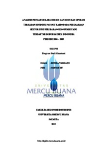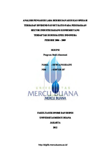 ANGGRAINI, DEWI (2012) ANALISIS PENGARUH LABA BERSIH DAN ARUS KAS OPERASI TERHADAP DIVIDEND PAYOUT RATIO PADA PERUSAHAAN SEKTOR INDUSTRI BARANG KONSUMSI YANG TERDAFTAR DI BURSA EFEK INDONESIA PERIODE 2006 – 2009. S1 thesis, Universitas Mercu Buana Jakarta.