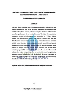 This study aimed to provide empirical evidence on the effect of project cost and general administration cost to the net profit achievement by examining each variables. Through this research, will be showing that which one of the variables can effect significantly to the net profit achievement. The object of research is the construction service and telecommunication installation on PT Putra Alinson Perkasa. Data that used in this research from financial statements since 2008 until 2010. Variables that used in this research are net profit achievement as dependent variable symbol Y, project cost as independent variable symbol X1, and general administration cost as independent variable symbol X2. Analysis model used in this research is multiple regression analysis model performed with the aid of the computer program SPSS version 17.0 for Windows. The result of this research indicates that project cost partially effect net profit achievement by significantly, meanwhile general administration cost did not effect net profit achievement by significantly. However, project cost and general administration cost simultaneously effect the net profit achievement by significantly