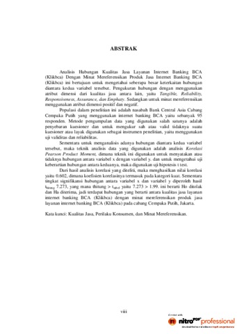 Analisis Hubungan Kualitas Jasa Layanan Internet Banking BCA (Klikbca) Dengan Minat Mereferensikan Produk Jasa Internet Banking BCA (Klikbca) ini bertujuan untuk mengetahui seberapa besar keterkaitan hubungan diantara kedua variabel tersebut. Pengukuran hubungan dengan menggunakan atribut dimensi dari kualitas jasa antara lain, yaitu Tangible, Reliability, Responsiveness, Assurance, dan Emphaty. Sedangkan untuk minat mereferensikan menggunakan atribut dimensi positif dan negatif. Populasi dalam penelitian ini adalah nasabah Bank Central Asia Cabang Cempaka Putih yang menggunakan internet banking BCA yaitu sebanyak 95 responden. Metode pengumpulan data yang digunakan salah satunya adalah penyebaran kuesioner dan untuk mengukur sah atau valid tidaknya suatu kuesioner atau layak digunakan sebagai instrumen penelitian, yaitu menggunakan uji validitas dan reliabilitas. Sementara untuk menganalisis adanya hubungan diantara kedua variabel tersebut, maka teknik analisis data yang digunakan adalah analisis Korelasi Pearson Product Moment, dimana teknik ini digunakan untuk menyatakan atau tidaknya hubungan antara variabel x dengan variabel y. dan untuk mengetahui uji keberartian hubungan antara keduanya, maka digunakan uji hipotesis t test. Dari hasil analisis korelasi yang diteliti, maka menghasilkan nilai korelasi yaitu 0.602, dimana koefisien korelasinya termasuk pada kategori kuat. Sementara tingkat signifikansi hubungan antara variabel x dan variabel y diperoleh hasil thitung 7.273, yang mana thitung > ttabel yaitu 7.273 > 1.99. ini berarti Ho ditolak dan Ha diterima, jadi terdapat hubungan yang berarti antara kualitas jasa layanan internet banking BCA (Klikbca) dengan minat mereferensikan produk jasa layanan internet banking BCA (Klikbca) pada cabang Cempaka Putih, Jakarta.