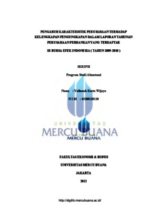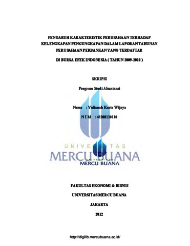 WIJAYA, YULIANAH KARTA (2012) PENGARUH KARAKTERISTIK PERUSAHAAN TERHADAP KELENGKAPAN PENGUNGKAPAN DALAM LAPORAN TAHUNAN PERUSAHAAN PERBANKAN YANG TERDAFTAR DI BURSA EFEK INDONESIA (TAHUN 2009-2010). S1 thesis, Universitas Mercu Buana Jakarta.