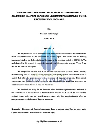 he purpose of this study is to empirically prove the influence of firm characteristics that affect the completeness of the disclosure the anuual report. This study uses 17 banking companies listed on the Indonesia Stock Exchange in the reporting period of 2009-2010. The analysis used in this research is descrivtive analysis, multiple regression analysis, T test, F test and test the classical assumption. The independent variable used is the ratio of liquidity (Loan to deposit ratio), solvency (Debt to equity ratio and capital adequacy ratio), and profitability (Return on assets and return on equity) that affect the completeness of the disclosure of financial statements. These results indicate that the variable liquidity, solvency and profitability are significant related to the completeness of the disclosure of financial statements. The results of this study, for the F test that all the variables together have an influence on the completeness of the disclosure of financial statements and for T test of the five variables included in this study only the variable debt to equity ratio does not significantly affect the completeness of the disclosure of financial statements.