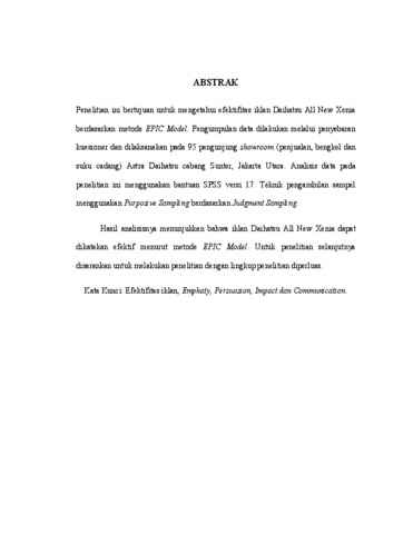 Penelitian ini bertujuan untuk mengetahui efektifitas iklan Daihatsu All New Xenia berdasarkan metode EPIC Model. Pengumpulan data dilakukan melalui penyebaran kuesioner dan dilaksanakan pada 95 pengunjung showroom (penjualan, bengkel dan suku cadang) Astra Daihatsu cabang Sunter, Jakarta Utara. Analisis data pada penelitian ini menggunakan bantuan SPSS versi 17. Teknik pengambilan sampel menggunakan Purposive Sampling berdasarkan Judgment Sampling. Hasil analisisnya menunjukkan bahwa iklan Daihatsu All New Xenia dapat dikatakan efektif menurut metode EPIC Model. Untuk penelitian selanjutnya disarankan untuk melakukan penelitian dengan lingkup penelitian diperluas.