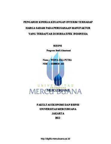 PUTRA, WIDYA EKA (2012) PENGARUH KINERJA KEUANGAN INTERIM TERHADAP HARGA SAHAM PADA PERUSAHAAN MANUFAKTUR YANG TERDAFTAR DI BURSA EFEK INDONESIA. S1 thesis, Universitas Mercu Buana Jakarta.
